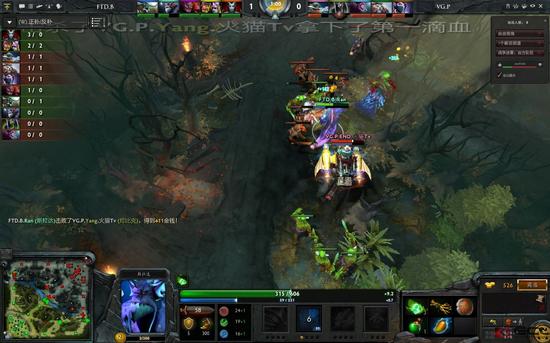TA逼天辉中路一塔,藏在一塔树林的鱼人开加速踩晕TA,lion跟上技能,随后双方支援都赶到,虽然暗牧给出薄葬,但只是拖延了一点时间,TA和自己都被带走,随后追击过程中拉比克和海民也交掉,FTDB只损失了鱼人一人。