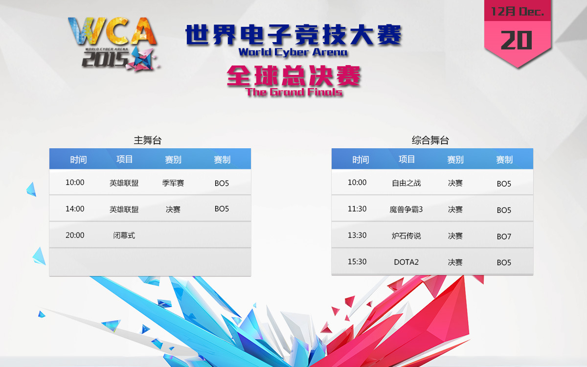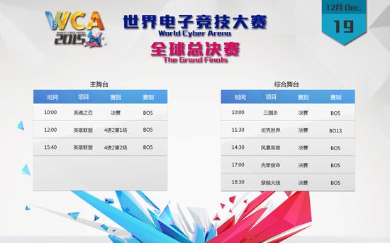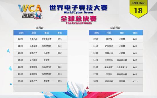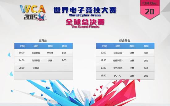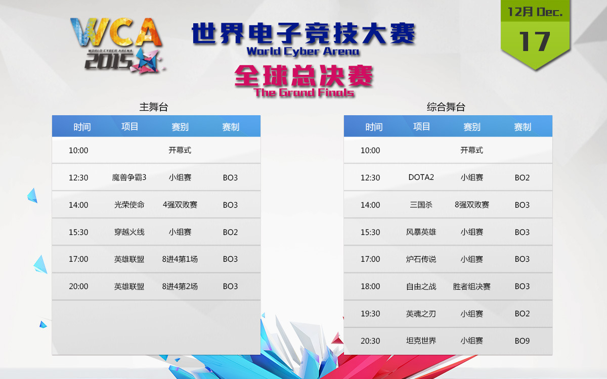 WCA2015全球总决赛将于2015年12月17日至12月20日再次在银川举行,届时将有32个国家和地区的700多名选手参赛。本次比赛共设有11个比赛项目,分别为炉石传说、自由之战、光荣使命、英魂之刃、DOTA2、英雄联盟、穿越火线、风暴英雄、三国杀、坦克世界、魔兽争霸3。本届WCA全球总决赛共设主舞台和综合舞台2个舞台,以下为详细直播安排: