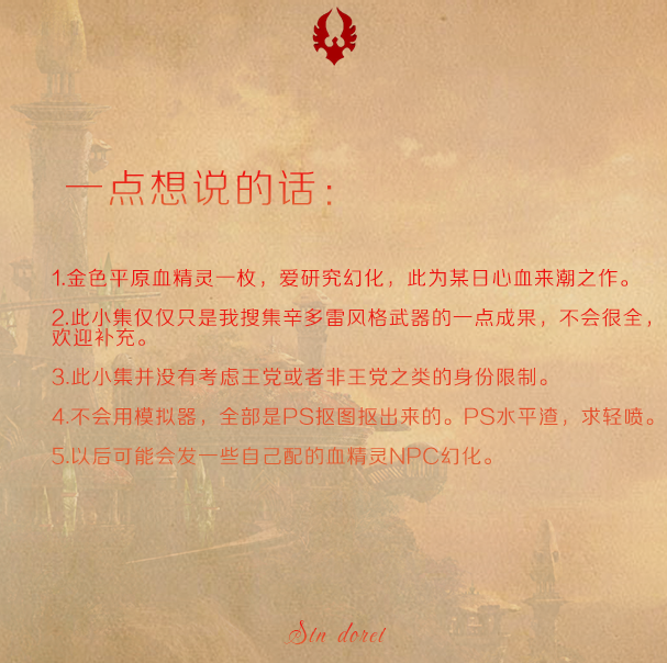 最近在金色平原玩,心血来潮整理了一下血精灵风格的幻化武器,希望对大家有帮助~~