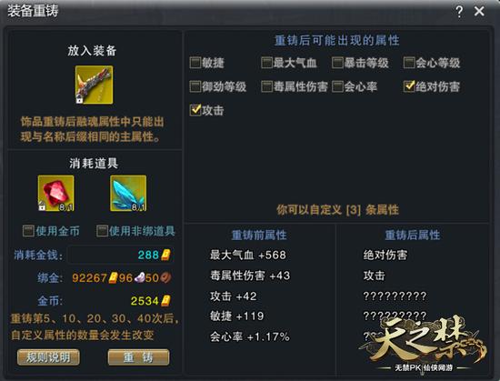 装备重铸一直是《天之禁》的一道亮丽的风景线,通过消耗重铸石和重铸之心,将装备的融魂属性进行重铸,随机出现新的融魂属性。新的重铸系统,能够在重铸过程中将自己心仪的属性锁住,其他属性进行随机出现,这样既可以减少偶然性的发生,极品装备唾手可得。