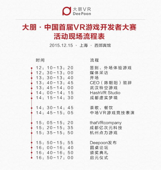 大朋中国首届VR游戏开发者大赛总决赛包括开发者路演、嘉宾评审、行业圆桌论坛等多个环节,针对开发者团队,决出优秀VR游戏内容,并就“启元”主题对虚拟现实行业发展未来进行深入讨论,从多方面解析行业前景。此外,大朋VR增设外场体验环节,参加本次总决赛的观众可在外场首次体验多款参赛的作品。
