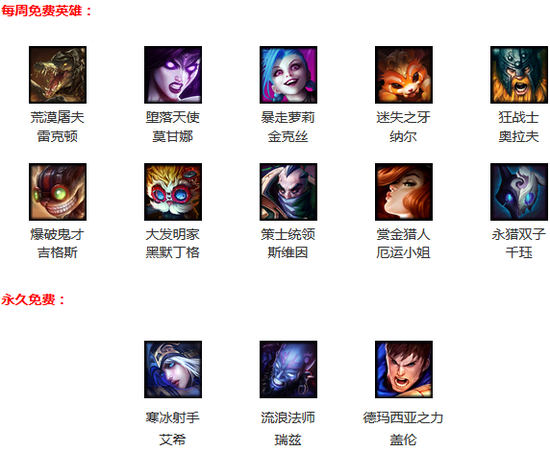 另外,在中国的服务器中,我们额外增加了三个永久免费的英雄——寒冰射手艾希、德玛西亚之力盖伦和流浪法师瑞兹。这三个英雄是永久免费供所有玩家使用的。主要目的也是便于那些刚刚打完新手实战训练营的玩家能够至少有一个自己会用的英雄。