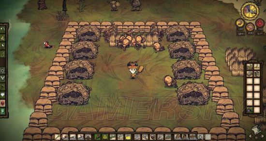 中间围一个草墙,里面放一个“逗猴球”(新道具,在生存栏),周围放些猴子窝。