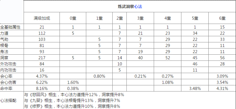 天涯明月刀炼武洞察心法满级属性图 天刀心法大全