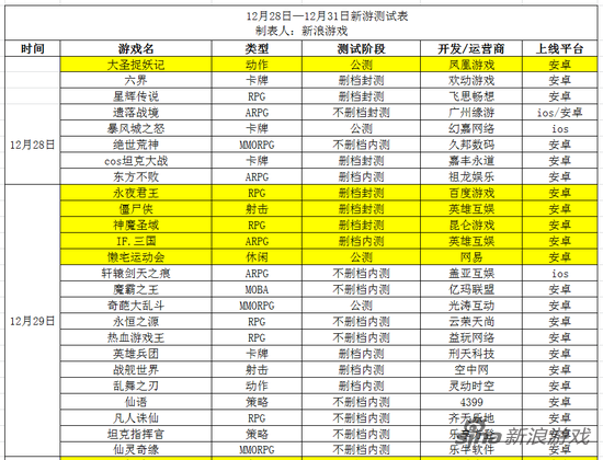 随着元旦的临近2015年也已经接近尾声了。虽然本周游戏偏少,但并不影响各大游戏厂商的竞争热情。加之接近元旦假期,上线新游有望通过假期营销来获取用户,在游戏的品质与题材上各家厂商都费足了脑筋,争取在新的一年来临际有好的表现。以下是新浪游戏一周新游列表。
