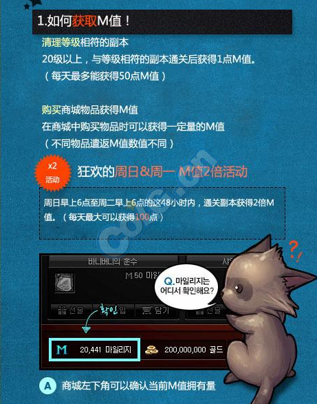 正常来说,M值的最好来源就是充值,充值送的M值比刷图多得多,以韩服的比例来说,买29800点券的东西,送957M值,这个当然也有过变化,只能当个参考。。