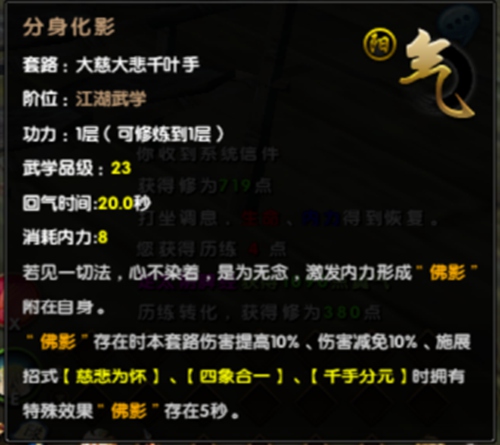 核心招来了,可以看到很多招式都基于它有了质变,本身也增加免10%和增加10%伤害。1层存在5秒,修到4层可存在8秒。