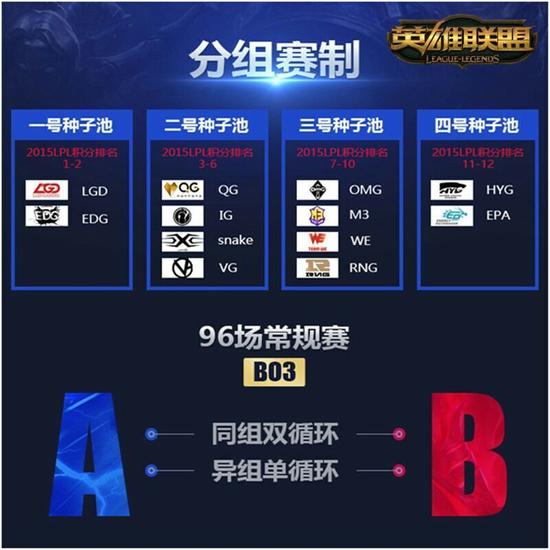 图2:分组赛制图抽签过后,LPL2016春季赛对阵格局确定:12支LPL队伍已被分为A、B两组,A组:LGD、Snake、QG、WE、M3和EPA,B组:EDG、IG、VG、RNG、OMG和HYG。 在经历过世界总决赛的洗礼,LGD、EDG与IG已成长为LPL当中的顶尖力量;而在上个赛季被称为黑马的两支队伍Snake与QG也已取得了长足的进 步;与此同时,WE、M3、VG、RNG与OMG三支队伍在2015年中也总结了不少的经验,在2016年中将更好的展现自己。在HYG和EPA两支刚进 入LPL的队伍中,HYG抽到了两支在前不久参加世界总决赛的队伍IG和EDG。而EPA则与LGD、Snake和QG同组,面对一支刚进入总决赛的 LGD和两支黑马,也称得上是一个“准死亡之组”。各支战队会有怎样的精彩表现,《英雄联盟》与广大召唤师共同关注。