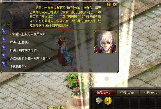 魔幻之旅,惊险刺激。珍爱生命,切勿观看! 2016年1月1日至2016年1月4日,元旦特使爱玛携魔蛋宝仔呆呆等来到久负盛名的卡诺萨城,为雷鸣大陆上的勇士们献艺。当然,可别忽略 了元旦盛典积分牌,有了它,每天上线你都可以找爱玛领取10点元旦积分;完成另外3个活动(“幸运转转转”、“新年焰火派对”和“宝蛋迷踪”)也可以领取 元旦积分,而积分可用于换取各种好礼。