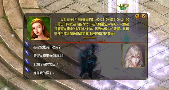 在“幸运转转转”、“新年焰火庆典”和“宝蛋迷踪”这3个精彩活动里,你幸运地获得了晶蓝魔锤和炫金魔锤。听说,携有此魔锤的朋友,可于每晚21:00-22:00和23:00-24:00在元旦特使爱玛的魔法帮助下,进入魔蛋宝库探索神秘宝藏!