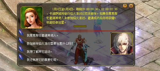| 1、为了迎接新年,1月1日至1月4日,每晚20:00-20:30、22:00-22:30,卡诺萨城将举办焰火派对。 2、凭借元旦庆典邀请函,每天可找元旦特使爱玛(346,398)领取1枚超级幸运星!超级幸运星可用来参与“幸运转转转”活动。 3、帮助爱玛邀请东方云游者李(279,464)、魔法师学徒夏妮妮(279,461)、诗人菲蒙(278,472)参加焰火派对,还可获得他们赠送的超级幸运星! 4、焰火派对期间,卡诺萨城内的特定角落将出现9个焰火,每3分钟燃放一次,新年礼物也将从天而降。 5、焰火精灵还将随机出现在某一燃放点,带来意想不到的惊喜! 6、此外,持有元旦盛典积分牌,每日上线可找爱玛领取元旦积分。此外,完成“宝蛋迷踪”、“幸运转转转”和“新年焰火派对”也可以领取元旦积分,而积分可以用于兑换奖励。 7、活动期间首次领取元旦积分,可获1枚十周年纪念币,纪念币可用于兑换绝版十周年坐骑。 |