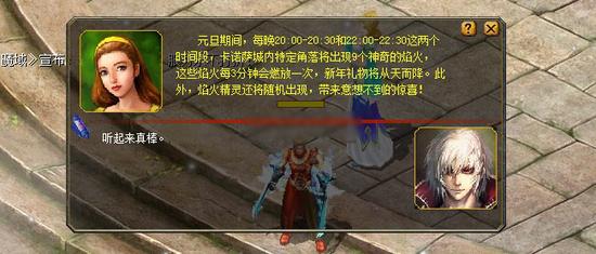 而卡诺萨城内的某些角落将出现9个魔法焰火,每3分钟魔法焰火都将燃放并且喷洒出大量节日礼物。 此外,一个焰火精灵小火花也将随机出现在一个燃放点,它将送出最特别的节日惊喜!每一次燃放结束之后,焰火精灵小火花都会移动它的位置,随机出现在其它的燃放点.它最爱玩捉迷藏了,但是只要你跟它对话,可爱的它就会悄悄地告诉你它下次会出现在哪里。