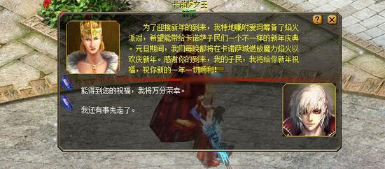 元旦期间每晚20:00-20:30、22:00-22:30,女王陛下也将出现在焰火派对上,你若能与她对话,就将得到最诚挚的新年祝福。
