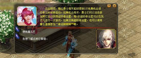 另外要注意的是,每人每天能够得到3次免费机会进行“幸运转转转”活动。如果机会用尽,你可以选择参加其它活动获得超级幸运星,每1枚超级幸运星可以进行一次游戏。如果没有超级幸运星,也可以使用魔石直接参加活动哦。 ![]()