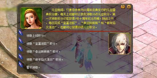 此外,完成“幸运转转转”活动还可通过元旦盛典积分牌累积元旦积分,用于换取各种好礼。活动期间首次领取积分,还可获得1枚十周年纪念币,纪念币可用于换取十周年绝版坐骑。具体规则请查看十周年纪念币活动页面。(//hd.my.99.com/coin/) |