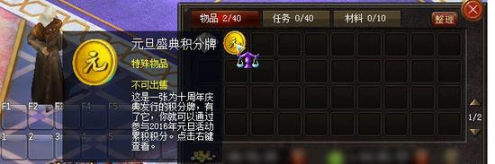 ![]() 名称:元旦盛典积分牌 物品说明:这是一张为十周年庆典发行的积分牌,有了它,你就可以通过参与2016年元旦活动累积积分。点击右键查看。