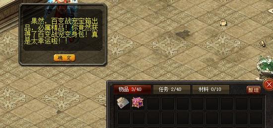 运气真不赖哦!你迫不及待地打开了宝箱,一个包装精美的百变战宠变身包出现在你面前,收获不错哦。 ![]()