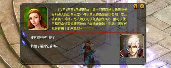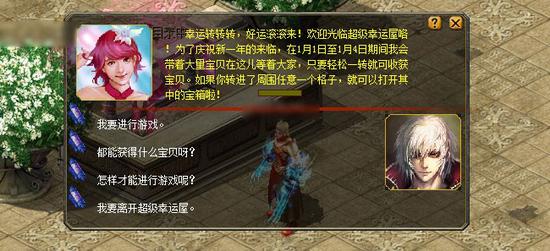 | 1、2016年1月1日至2016年1月4日,找到卡诺萨城的元旦特使爱玛(346,398),了解“幸运转转转”活动详情。 2、找到超级幸运屋的幸运使者爱丽丝(75,80),可参加“幸运转转转”活动。 3、只要转进超级幸运屋周围任意一个格子,就可以打开其中的宝箱,获得丰厚奖励。 4、每人每天可以免费参加3次,更可以使用超级幸运星或魔石参与“幸运转转转”活动。 5、此外,持有元旦盛典积分牌,每日上线可找爱玛领取元旦积分。此外,完成“宝蛋迷踪”、“幸运转转转”和“新年焰火派对”也可以领取元旦积分,而积分可以用于兑换奖励。 6、活动期间首次领取元旦积分,可获1枚十周年纪念币,纪念币可用于兑换绝版十周年坐骑。 |