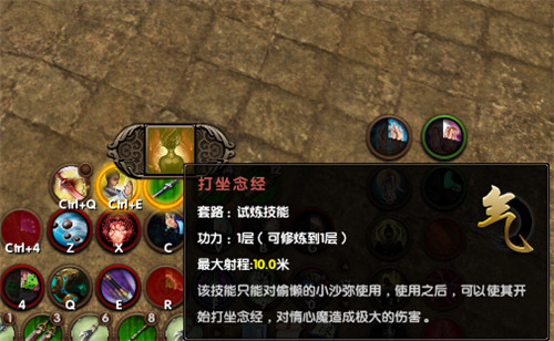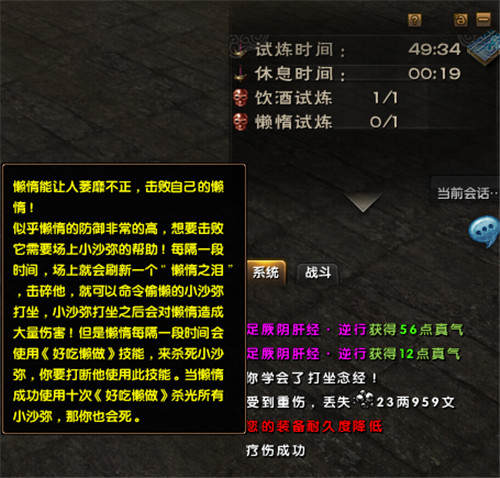 击杀“酒魔”后,小编遇到的第二重考验则是“懒惰”。这个BOSS大侠们无需攻击他,只需要不停的使用轻功躲避BOSS的技能即可。当场景中出现“懒惰之泪”时,大侠将之击杀后便可得到临时技能“打坐念经”。