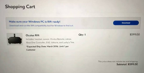 期待已久的Oculus Rift消费者版终于等到了!北京时间1月7日零点,Oculus官方网站上,Oculus Rift终于开放预售,价格为599美元(折合人民币3900多元)。除了VR眼镜之外,一起配套预售的还有微软Xbox手柄、耳机以及追踪系统。除了需要支付599美元设备价格外,还需要支付30美元运费,设备将在3月份配送。