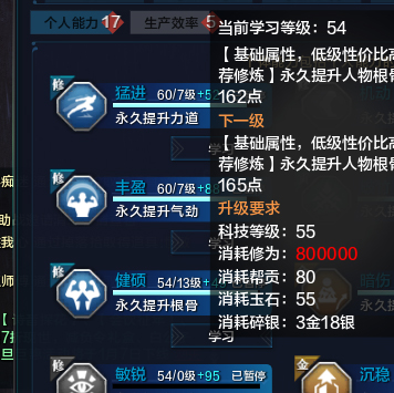 那么这里就得出54级的帮派技能之前平均修为增加的属性是不是要比你点那种50W增加2点属性的经脉要划算的多?