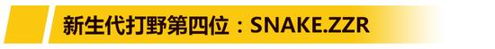 ZZR作为一个完全的新人选手,在加入Snake之前没有打过职业。大号常年盘踞在Rank榜前二十位置的他,是作为一个高分路人被Snake挖掘 进战队的。在加入Snake之后随队参加了LPL夏季赛、NESO、NEST、WCA等比赛,发挥也都可圈可点。因为他年纪小,赛场经验也并不多,相信在 未来的一年里,他会继续汲取经验,成长为一个更为可靠的打野。