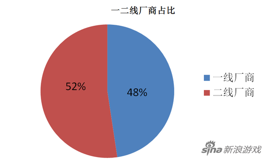 在一二线游戏厂商占比上因本周13家一线厂商齐齐发力所以本周占比较为均衡。大厂游戏上线占比48%且大部分都带IP。而像网易这样的豪门本周一口气砸出5款新游可见大厂的IP游戏库存是多么的充裕。不得不数对于中小CP2016年的游戏竞争将更为激烈。