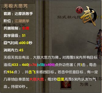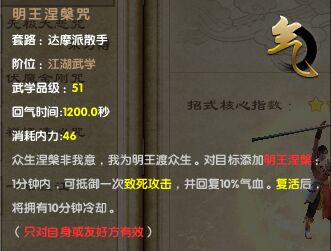 佛有云:“菩提本无树,明镜亦非台。”佛心济世的达摩派,在散招中也蕴含了“慈悲为怀”的佛家真理,以“恢复、辅助”为主。从效果上来看,不论是黄霸体打坐,还是抵挡致死伤害的复活,无疑都大大提高了达摩弟子们的团战生存能力!