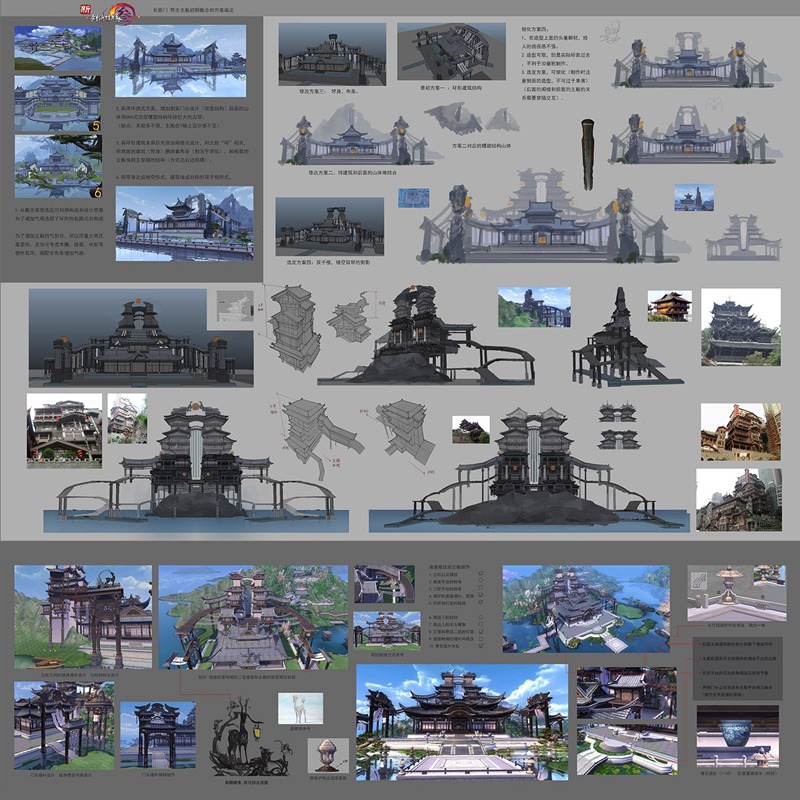 确定地貌特征后,在确定建筑风格时候参考大量的园林建筑,因为园林不但作为最能体现东方文化的建筑,而且这种咫尺之内有乾坤的建筑特色也十分符合长歌门内敛而大气的门派精神。