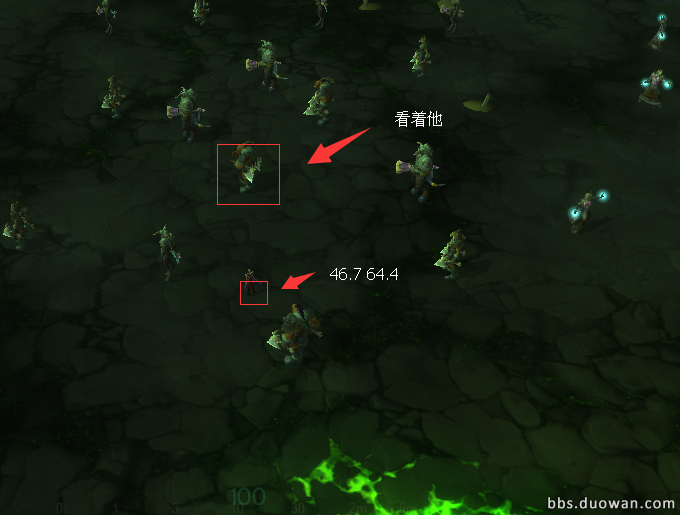 击杀动画过后,场景中会出现一大堆霜狼兽人,此时需要站该坐标上不动,将角色方向朝向10点钟方向的霜狼兽人,如下图所示。