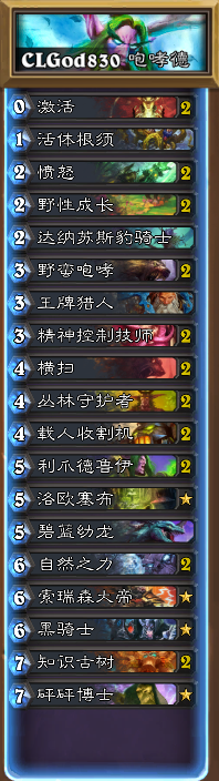 德鲁伊近期依旧风生水起,很多时候费用上的领先都能让德鲁伊扳回对阵构筑上的劣势,这也是德鲁伊持续风靡的原因之一。我们本次选用的卡组是 CLgod830在1月2日美服登顶的德鲁伊套牌。构筑上讲,选用"活力根须"的好处在于可以补刀打伤害,并且可以为达纳苏斯豹骑士的2费进场扫除障碍。双"精神控制技师"是这套牌的最大亮点,这张牌可以让德鲁伊在天梯上洪水猛兽般的奥秘骑、恶魔园的围攻之下出奇制胜,"黑骑士"作为中速环境下的优秀针对牌,处理几近人手一张的"淤泥喷射者"或者"阿古斯防御者"架起来的生物都是十分理想的。总而言之,德鲁伊针对环境做一些针对牌的替换便可以分分钟领跑天 梯。