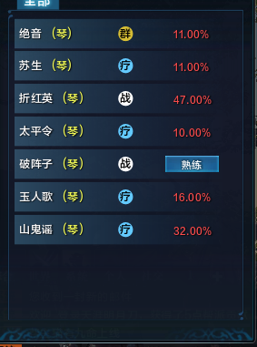 4、破阵子:效果增加内功。目前点满是50点内功,余音效果内外功提升50%暴击率30%时间持续30秒,非常恐怖的效果。一个余音30秒的时候差不多就能打下BOSS大半的血。
