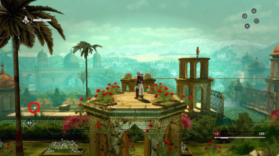 2。滑过去后打开机关(摇杆向上,之后不重复)开门,利用用毯子下去,之后继续往右会看到两个闲谈的敌人,爬上树跳向另外一棵树绕过去。