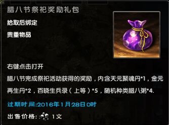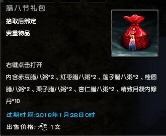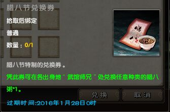 1。腊八粥均为绑定道具,有效期至2016年1月28日0时。