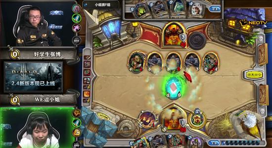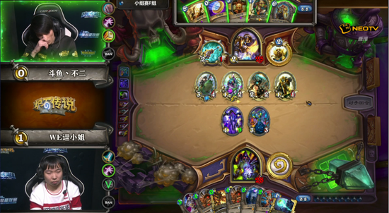 首盘战况,太极剑用天师速攻萨奇袭到了逗小姐的奥秘骑士,在萨满被骑士哈利森吃了一把毁灭之锤的情况下,萨满还是在6费结束了战斗,1:0,太极剑拿下首盘;第二盘逗小姐依旧以奥秘骑士迎战,太极剑则拿出了恶魔园术士,术士前期没站住场面反被骑士铺开了场,在6费回合术士的场面被骑士一个奉献完全清掉,术士无力回天,1:1;第三盘逗小姐祭出奴隶战,太极剑继续以恶魔园术士应战,奴隶战用旋风斩同时完成清场与铺场,让术士十分头疼,加上不断成长的暴乱狂战士的输出,逗小姐再下一城,2:1 逗小姐拿到赛点;第四盘,逗小姐的天师速攻萨一费就完成变身成为“雷克萨”,而太极剑的术士在前期并没有站到场面,3费回合术士为了苟活换取了战士的叠甲技能,术士丢掉强大的分流过牌以后在场面上无法和萨满相争,5费萨满就牢牢站住场面,6费回合就结束了战斗,3:1 WE逗小姐进入胜者组。