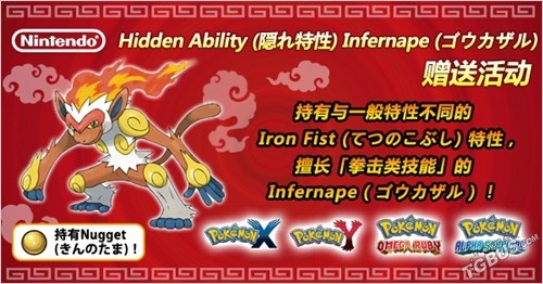 为庆祝农历新年,香港任天堂将会送上擅长“拳击类技能”的烈焰猴和大家迎接农历新年!这只烈焰猴带有与一般特性不同的Hidden Ability(隠れ特性)。兑换序号预定于1月28日晚18:30在微博上赠送。
