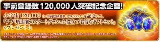 由于Bandai Namco Games开发中的超大作手游《圣斗士星矢Zodiac Brave》,事前登录人数已经突破12万人这个惊人数字,所以事前登录所送出的礼物亦大大份!预定将会送出“实惠礼品套装”的全新宣传活动!这只预定今冬推出的手游,将会在日本、台湾、韩国等地配信(香港玩家到时要玩日版了),事前登录者人数合计已达12万人突破!为了纪念突破12万人,所以特典亦有所追加,送出在手游配信后的Start Dash有用的“实惠礼品套装”!而“实惠礼品套装”的内容方面,主要是在游戏中有用的Item,包括“圣斗士Drink 10个”以及“10万coin”。