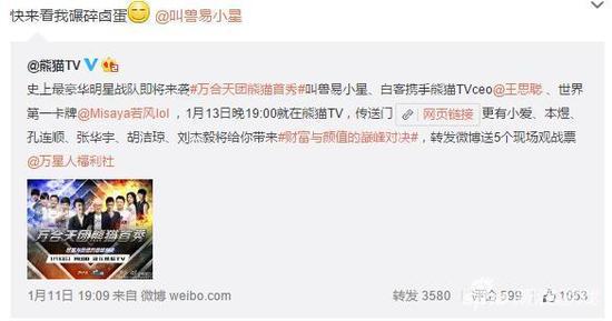 王思聪转发的微博是今晚在熊猫TV直播的#万合天团首秀#,从微博中不难看出,这个号称史上最豪华明星战队不仅有王思聪,还有叫兽易小星、白客、若风等等。