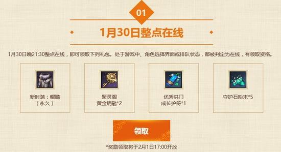 1月30日晚21:30整点在线,即可领取下列礼包。处于游戏中、角色选择界面或排队状态,都被判定为在线,有领取资格。