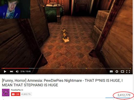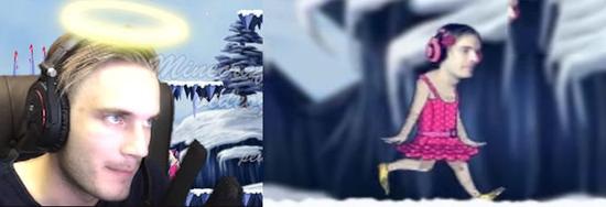 被吓尿了除了幽默的语言,Pewdiepie还“喜欢”自黑,把自己的头像PS到女性角色身上、做奇怪夸张的表情以及在游戏过程中自得其乐的哼唱自创的段子音乐等。有时候自己COS游戏里多个角色自言自语,比如:what the fuck is that?! hat's how we roll,bitch!当然这在粉丝眼中Pewdiepie创造了很多有趣的东西,但不了解他的人会觉得这是完全就是一个疯子、白痴!