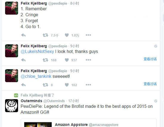 与粉丝在推特上的互动于是在2014年夏天,Pewdiepie发布了一段标题为“YouTube文化?”的视频,他在视频中说道,自己之所以称呼订阅者“兄弟”而非粉丝,是因为他认为每个人都是平等的。“我与你们一样,从任何角度来说都不比你们高一级。我希望努力打破横在我们之间的墙,因为我热爱与你们之间的亲切联系。Facebook和推特上的一些留言让我感到担心,让我们把它放一放吧。”