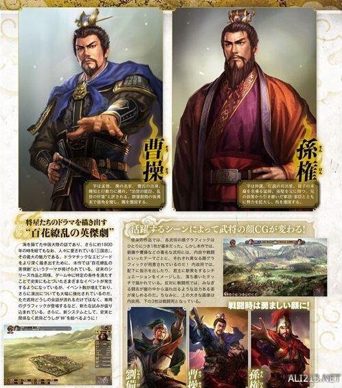 在以前的作品中,武将都只有一幅插图。而在《三国志13》中,像刘备、曹操这样的著名武将都会有以内政与战斗为主题的两种不同插图,在内政的时候会显示出一幅文雅的姿态,而在战斗中会显示出一幅勇猛的样子。