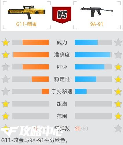 G11暗金和9A91相比威力和精准度略大于9A91。但是在射速和手持移速方面G11暗金比9A91稍显不足。在装弹数方面G11暗金明显比9A91更加充足,综合来看G11暗金和9A91基本持平。