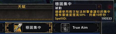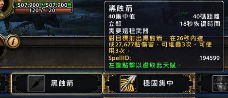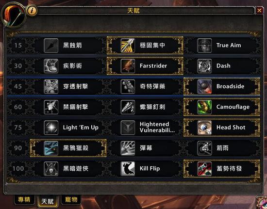 第一层15级天赋:黑箭需要天赋点出,而且可以叠加3层。 稳固集中改成连续2次奥术射击可以增加50%集中值回复速度。新天赋精确打击可以使目标叠加最多20层40%的易伤deubff。