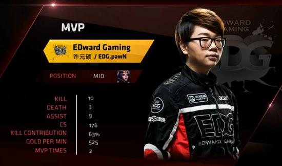 本局MVP是EDG的中单Pawn选手,他的妖姬在打野厂长给他带来优势之后成功地游走拿人头,打团爆炸输出。