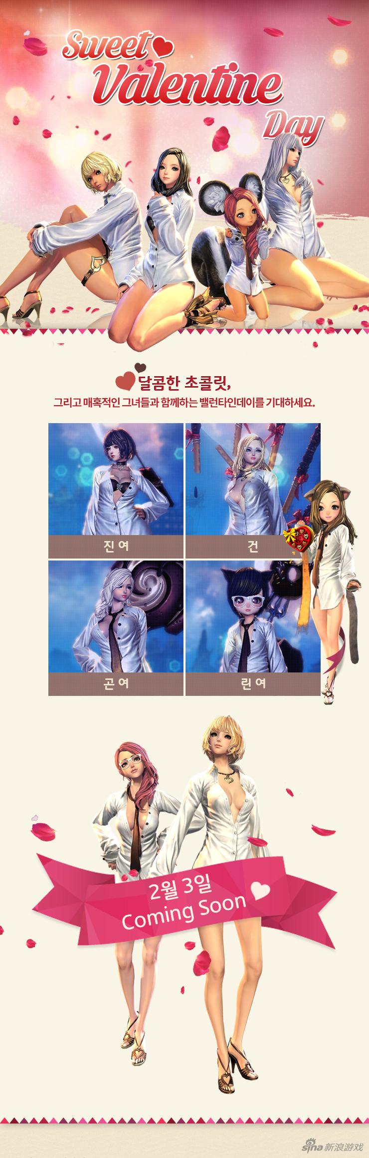 鲜艳红色的英文“【Coming soon】Sweet Valentine Day”甜蜜满满,白色背景飘满玫瑰花瓣,最重要的是——宽大的白色衬衣,没有全扣的纽扣,光洁油腻的大长腿,性感的爱心黑色腿环……龙女和天女更是真空上阵,这套情人节时装透出的色气简直要溢出到屏幕之外,相信各位绅士早已按耐不住心中的激动之情。
