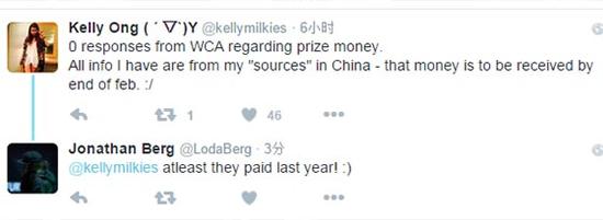 北京时间1月30日,A队前战队经理、Loda女友Kelly发推抱怨WCA的奖金迟迟不能发放。而她了解的情况是这笔奖金最早也要到二月底才能拿到。
