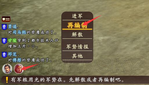 当军队抵达一座城市后,就可以点左下角的头像,然后点“再编制”补充一下粮草。
