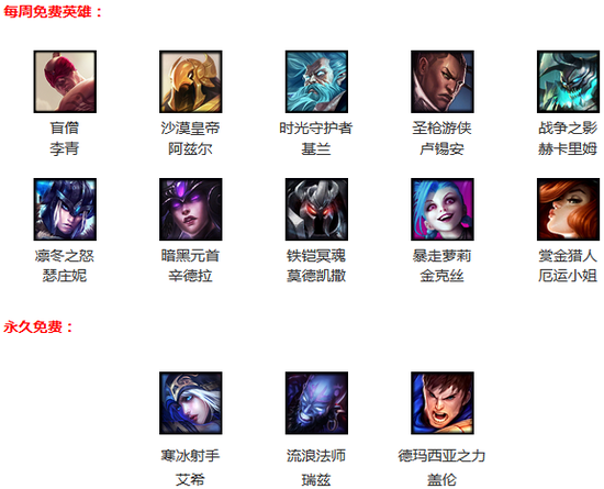 另外,在中国的服务器中,我们额外增加了三个永久免费的英雄——寒冰射手艾希、德玛西亚之力盖伦和流浪法师瑞兹。这三个英雄是永久免费供所有玩家使用的。主要目的也是便于那些刚刚打完新手实战训练营的玩家能够至少有一个自己会用的英雄。
