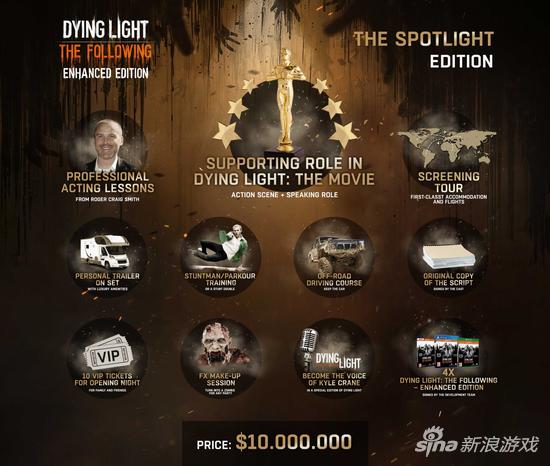 华纳兄弟日前和英国游戏零售商GAME合作,推出了《消逝的光芒:加强版》的噱头版本“明星版”(Spotlight Edition),其价格高达1000万美元,当然其中最吸引人的地方就是可以参演《消失的光芒》电影版的一个角色。